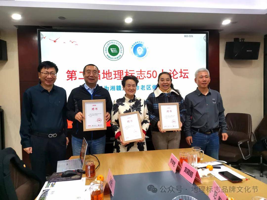 郑学勤、刘海铭共同为王璞、陈婕、宾颖超颁发了“湘赣边区域合作示范区地理标志品牌培育联席工作组专家”荣誉聘书。