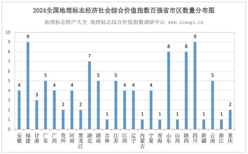 据《2024地理标志经济社会综合价值指数调研报告》显示全国地理标志综合价值百强分布在25个省市区,具体是:福建和四川数量最多,各9个;山东和陕西各8个;湖北7个、广东、湖南、江苏和云南各5个;安徽、广西、河南、江西、辽宁和宁夏各4个;甘肃3个;贵州、黑龙江和重庆各2个;吉林、内蒙古、青海、山西、新疆、云南和浙江各1个。