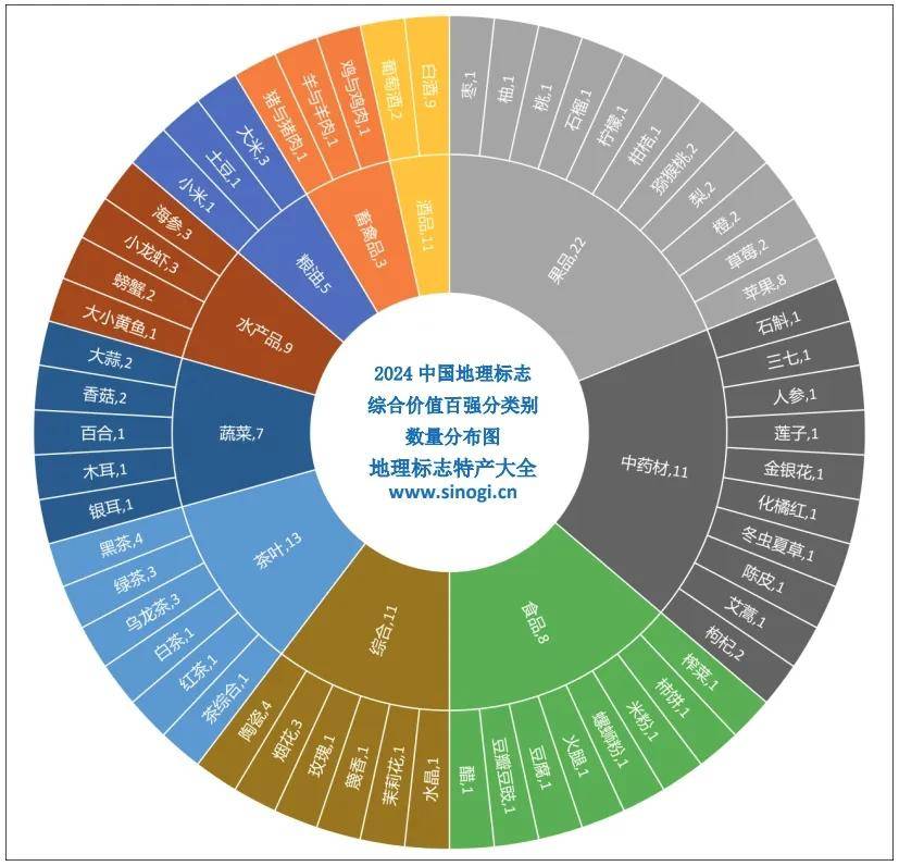 全国地理标志综合价值百强一级分类分布情况是:果品类数量最多,有22 个;茶叶类13个、中药材类11个、酒品类11个、综合类11个、水产品类9个、食品类8个、蔬菜类7个、粮油类5个、畜禽品类3个。全国地理标志综合价值百强二级分类分布情况是:白酒数量最多,有9个;苹果8个;黑茶和陶瓷各4个;大米、海参、绿茶、乌龙茶、小龙虾和烟花各3个,草莓、橙、大蒜、枸杞、梨、猕猴桃、螃蟹、葡萄酒和香菇各2个;艾蒿、百合、醋等39个二级分类各有1个。