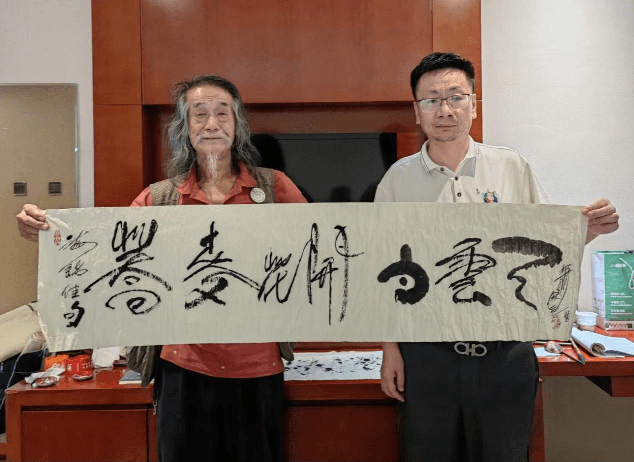 著名书画家萧宽老师为主题歌《荞麦花开》题字并与活动总策划、词作家品牌孵化学派创始人刘海铭合影留念 图片来源:主办方